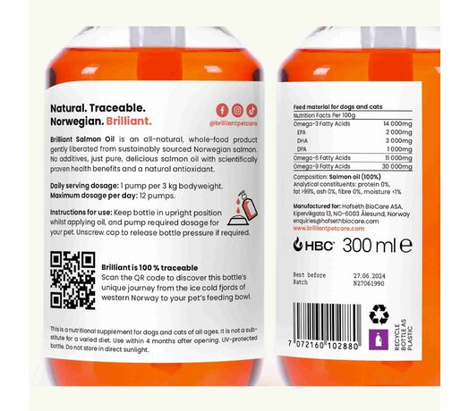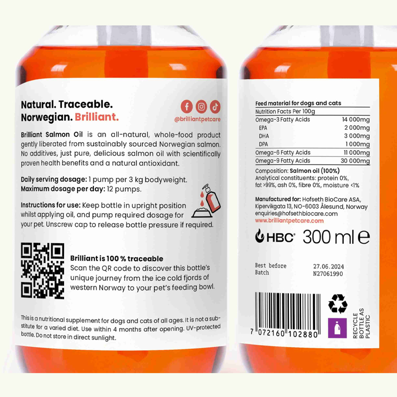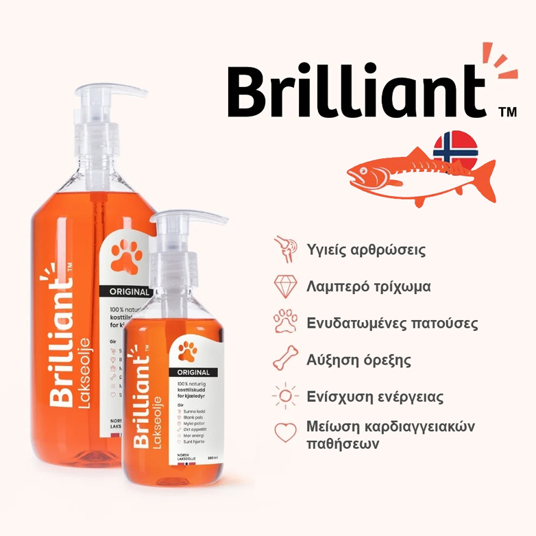 Το Brilliant Salmon Oil για σκύλους και γάτες είναι ένα φρέσκο, ακατέργαστο και φυσικό προϊόν, που προέρχεται από νορβηγικό σολομό. Χωρίς πρόσθετα το Brilliant Salmon Oil δίνει λάμψη στο τρίχωμα του κατοικίδιου ζώου σας, μαλακώνει τις πατούσες και προσδίδει ενέργεια. Bοηθήσει στην αύξηση της όρεξης του κατοικίδιου ζώου και στην μείωση των καρδιαγγειακών παθήσεων. Σε μπουκάλι με προστασία UV. Εύκολο στη χρήση με αντλία - dispenser που σας δίνει την σωστή ποσότητα κάθε φορά.