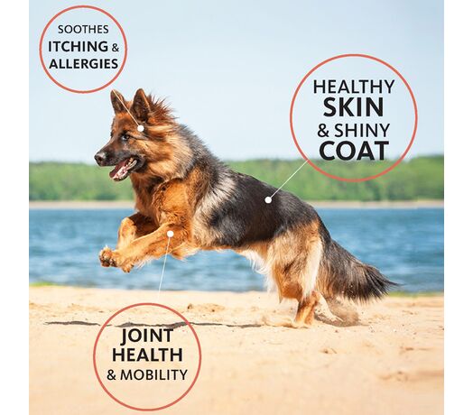 Αντιμετώπιση κνησμού και ξηροδερμίας: Μέσω επένδυσης σε επιστημονικές μελέτες, έχει σχεδιαστεί για να υποστηρίζει την υγεία των κατοικίδιων. Οι φυσικές αντιφλεγμονώδεις ενώσεις συμβάλλουν στη μείωση της τριχόπτωσης, στη διαχείριση της χοληστερόλης, στη μαλάκυνση των πελμάτων, στη βελτίωση της υγείας του δέρματος και στην υποστήριξη της κινητικότητας σε περιπτώσεις αρθρίτιδας.
